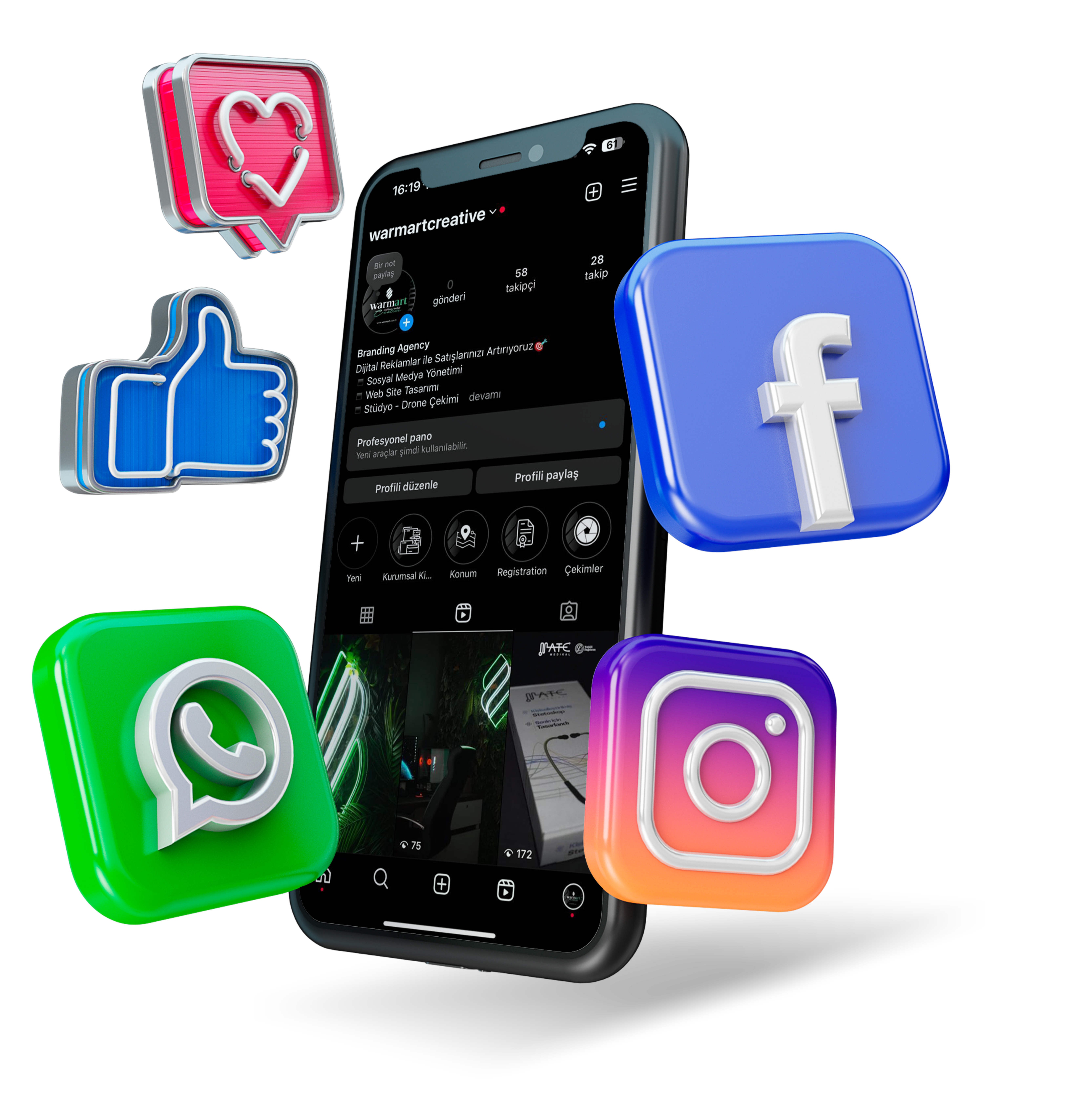 Sosyal medya yönetimi; video, grafik tasarım, web tasaraım ve SEO gibi alanlarda uzman ekibimizle, müşterilerimizin ihtiyaçlarına yönelik özel stratejiler geliştiriyoruz. Warmart Creative olarak, her projemizde müşteirlerimizin beklentilerini aşmayı ve dijital dünyada kalıcı izler bırakmayı amaçlıyoruz.